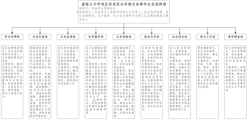 在区政府的统一领导下,根据工作需要,成立沙坪坝区突发环境事件应急处置指挥部(以下简称区指挥部),实行指挥长负责制,由区政府分管副区长任指挥长,统一领导、组织、指导应对工作。区指挥部下设综合协调、抢险救援(下设专家组)、应急监测、医学救援、应急保障、舆论引导、社会稳定、善后工作、事件调查等工作组(职责见附件1)。