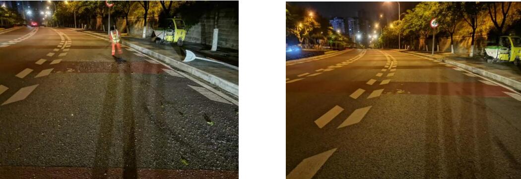 我局立即启动应急措施,迅速组织环卫工人赶到现场。工人们摆好安全锥,用扫帚把碎渣清理干净,装车运走。随后使用水枪和长刷反复冲刷路面,用时近两个小时,路面恢复干净整洁,隐患彻底排除。
