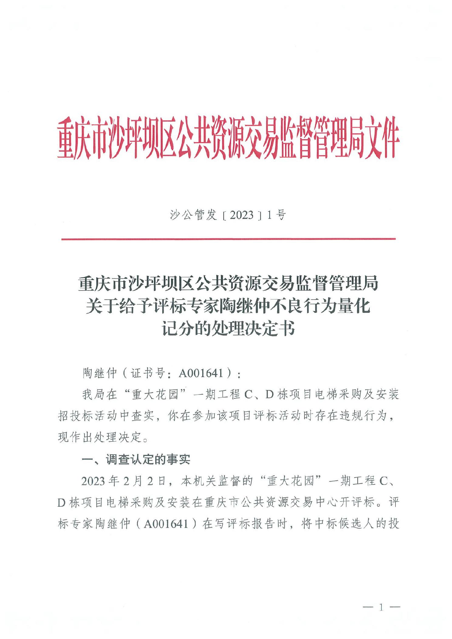 重庆市沙坪坝区公共资源交易监督管理局关于给予评标专家陶继仲不良行为量化记分的处理决定书