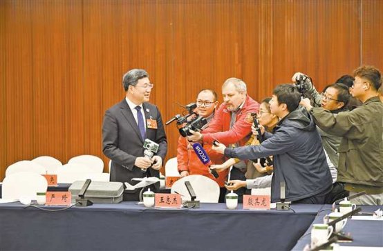 3月6日,十四届全国人大四次会议重庆代表团举行开放团组会议。会后,许多记者围绕关注的话题采访王志杰。记者 苏思 摄/视觉重庆