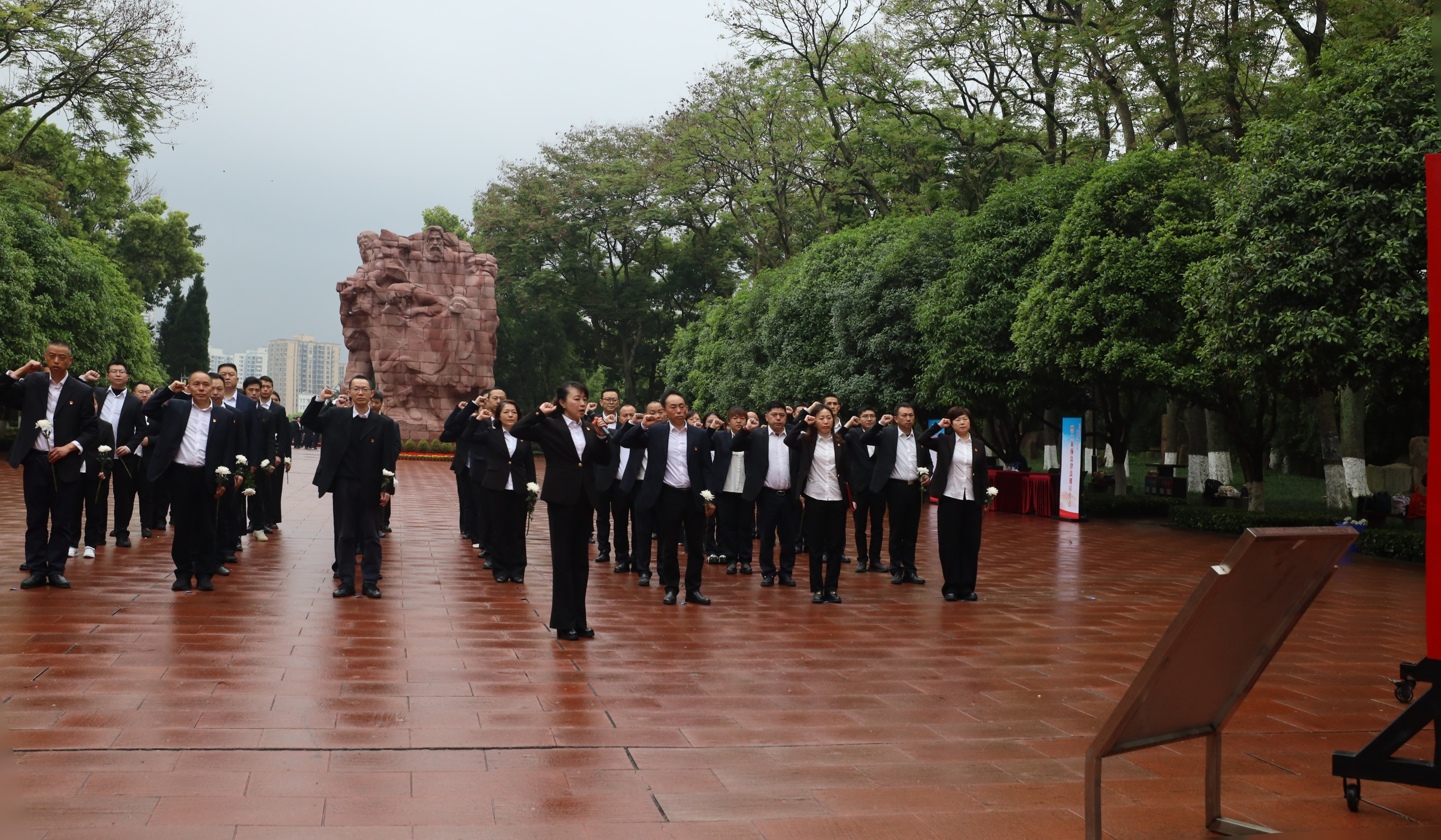 全体人员在烈士陵园广场整齐列队,面向烈士墓碑肃立。活动在蒙蒙细雨中拉开帷幕,全体人员向革命先烈默哀,表达对英烈的无限崇敬与深切缅怀。在局党组书记、局长简哨兵同志领誓下,全体党员面向鲜红党旗,高举右拳、庄严宣誓。铿锵誓言在陵园上空回荡,字字千钧,既是对先烈精神的庄严告慰,更是对初心使命的再次宣示。宣誓结束后,大家手持白菊依次敬献,深情缅怀长眠于此的革命先烈。