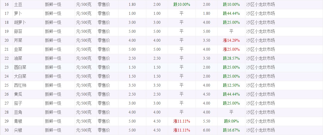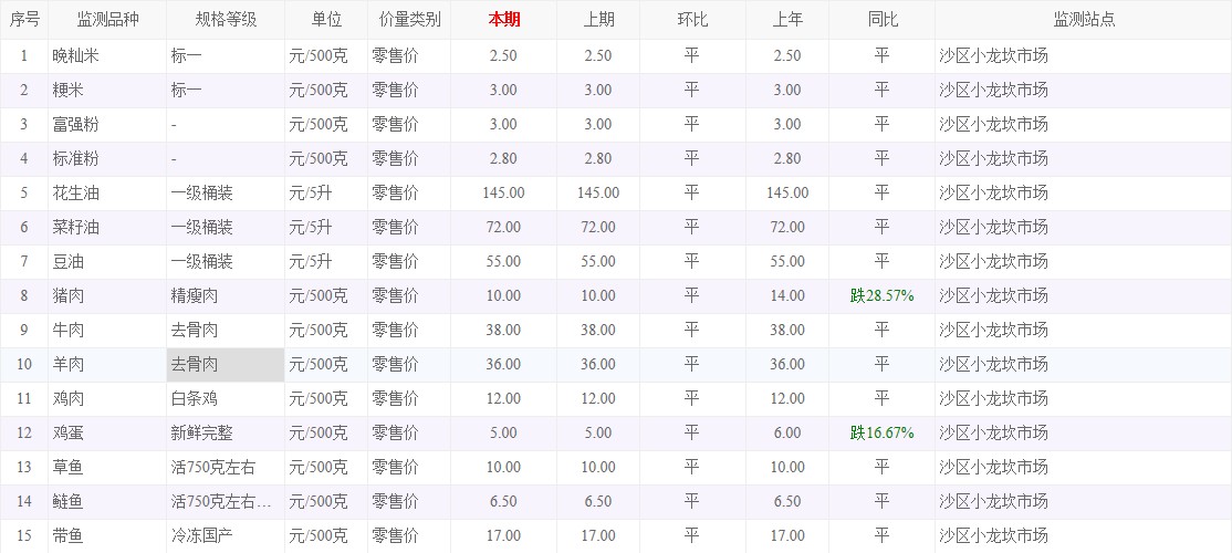 粮油内禽蛋菜水产品等价格应急监测情况(小龙坎农贸市场)采价日期(2025年9月18日)