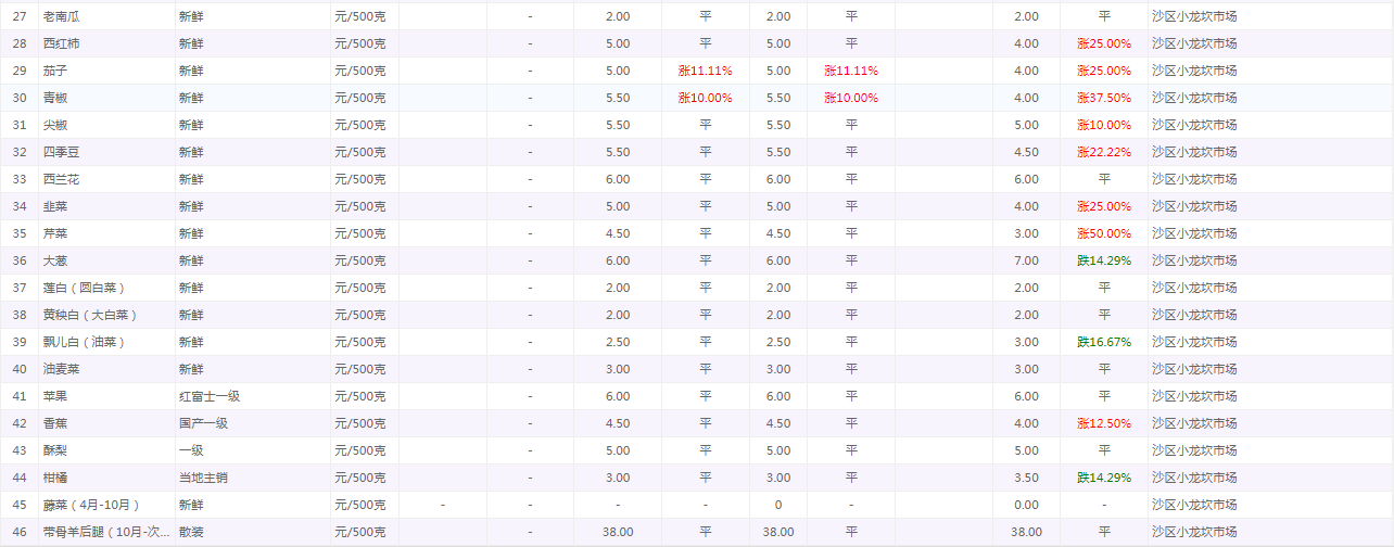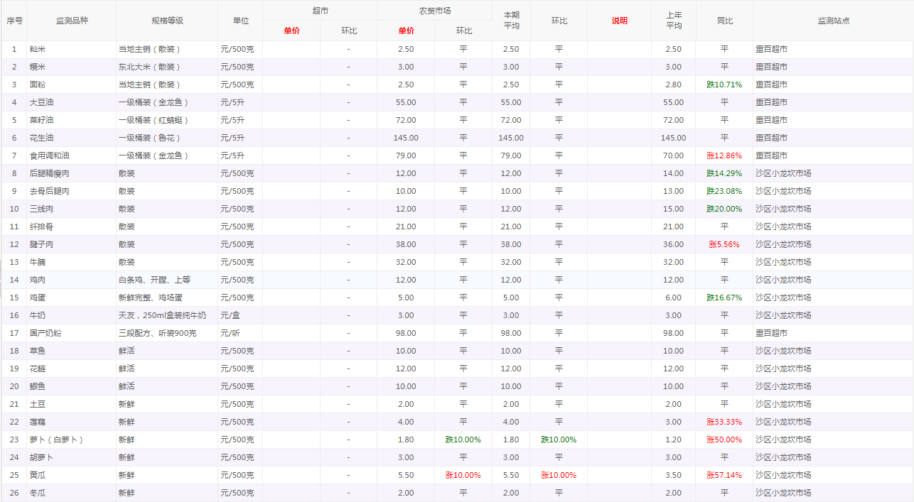 粮油内禽蛋菜水产品等价格应急监测情况(重百超市、小龙坎农贸市场)采价日期(2025年11月26日)
