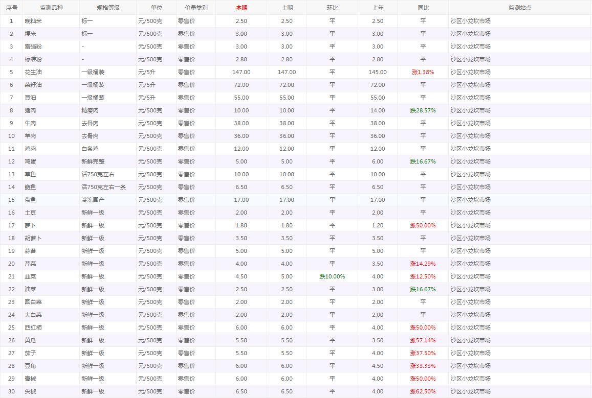 粮油内禽蛋菜水产品等价格应急监测情况(小龙坎农贸市场)采价日期(2025年12月8日)