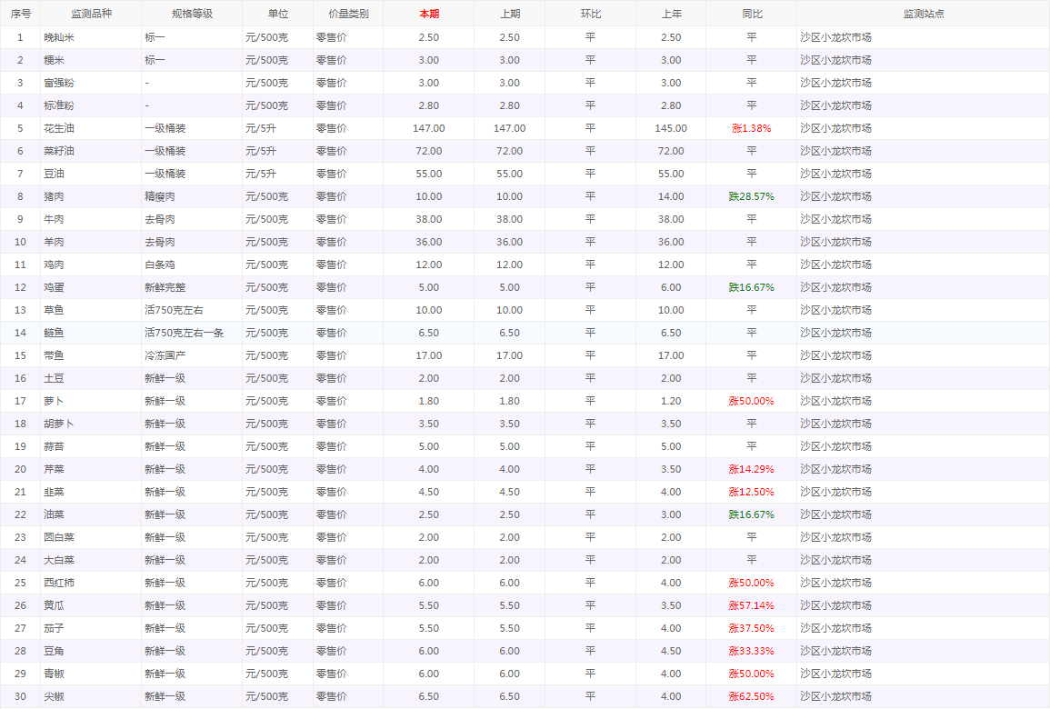粮油内禽蛋菜水产品等价格应急监测情况(小龙坎农贸市场)采价日期(2025年12月9日)