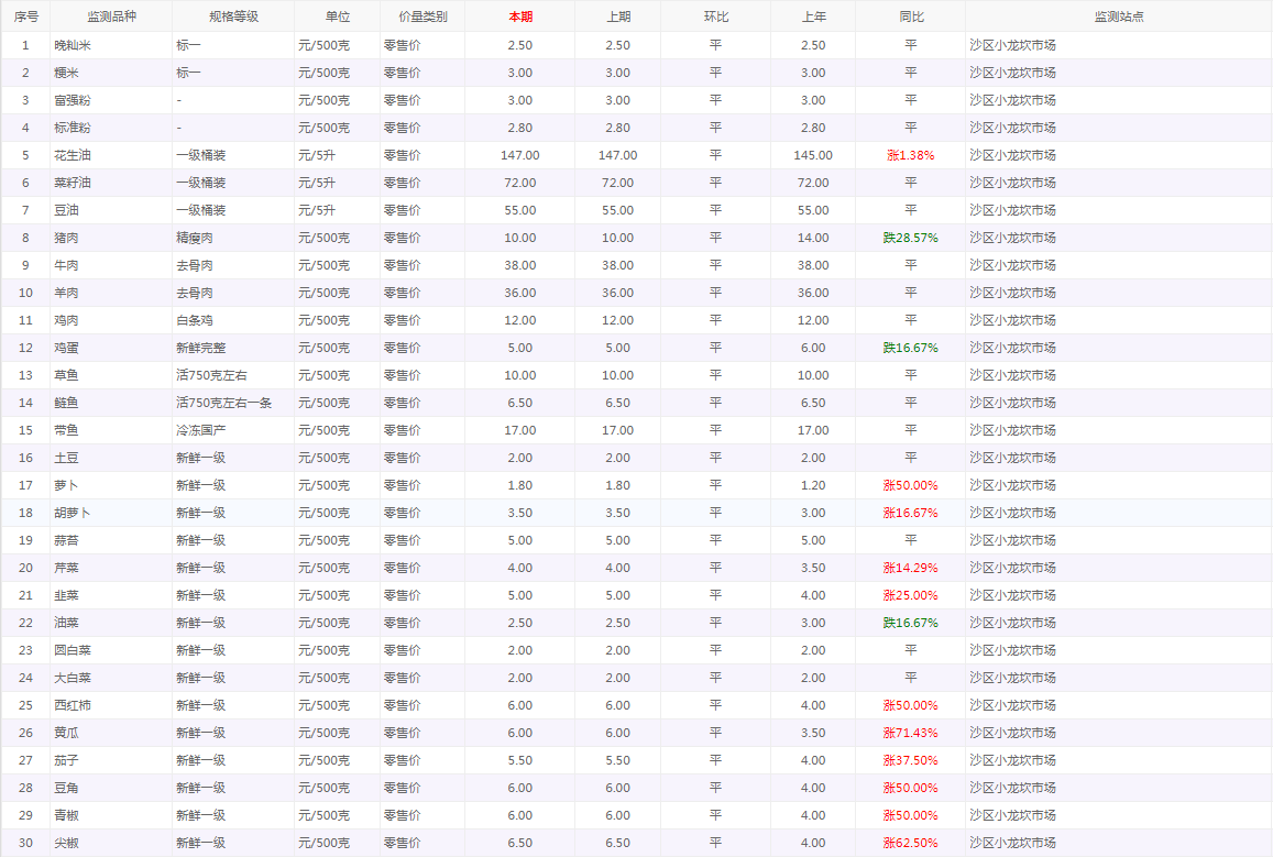 粮油内禽蛋菜水产品等价格应急监测情况(小龙坎农贸市场)采价日期(2025年12月11日)