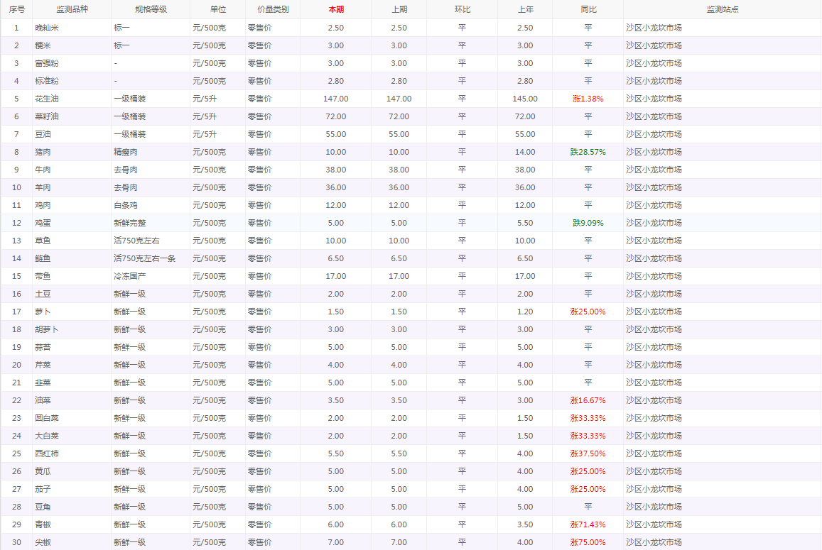 粮油内禽蛋菜水产品等价格应急监测情况(小龙坎农贸市场)采价日期(2025年12月30日)