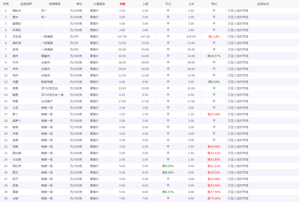 粮油内禽蛋菜水产品等价格应急监测情况(小龙坎农贸市场)采价日期(2026年1月5日)
