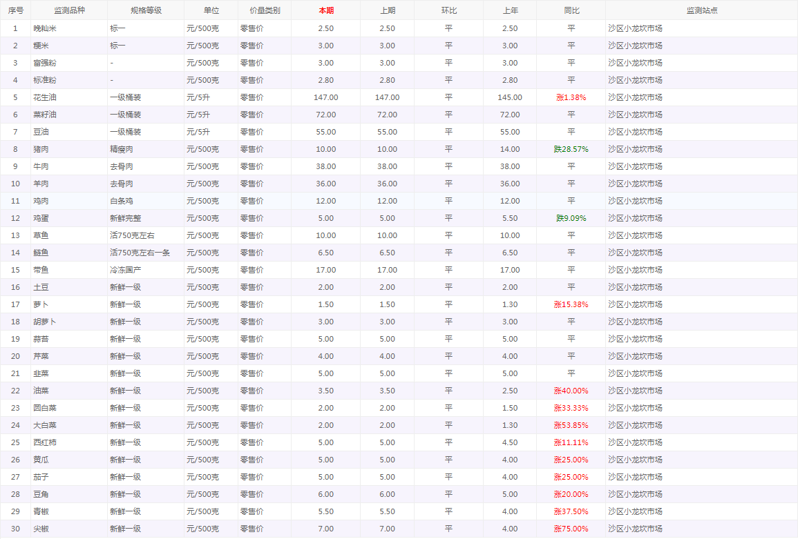 粮油内禽蛋菜水产品等价格应急监测情况(小龙坎农贸市场)采价日期(2026年1月6日)