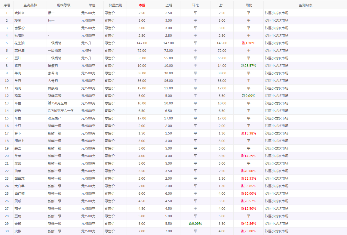 粮油内禽蛋菜水产品等价格应急监测情况(小龙坎农贸市场)采价日期(2026年1月13日)