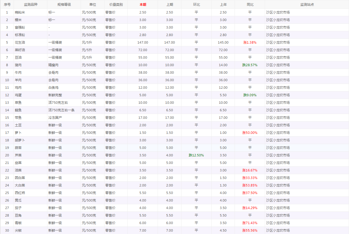 粮油内禽蛋菜水产品等价格应急监测情况(小龙坎农贸市场)采价日期(2026年1月30日)