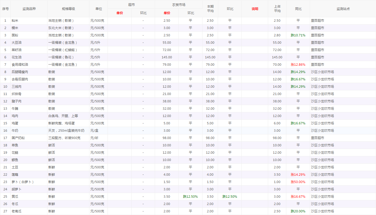粮油内禽蛋菜水产品等价格应急监测情况(重百超市、小龙坎农贸市场)采价日期(2026年4月8日)