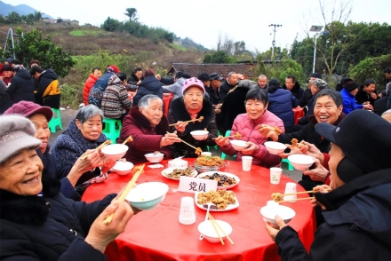 饭桌上,不聊生分话。企业老板和村民聊着明年的招工计划,镇干部问问老人棉被够不够厚。边吃边唠,平常难碰面的人,在一锅刨猪汤前热络成了自家人。