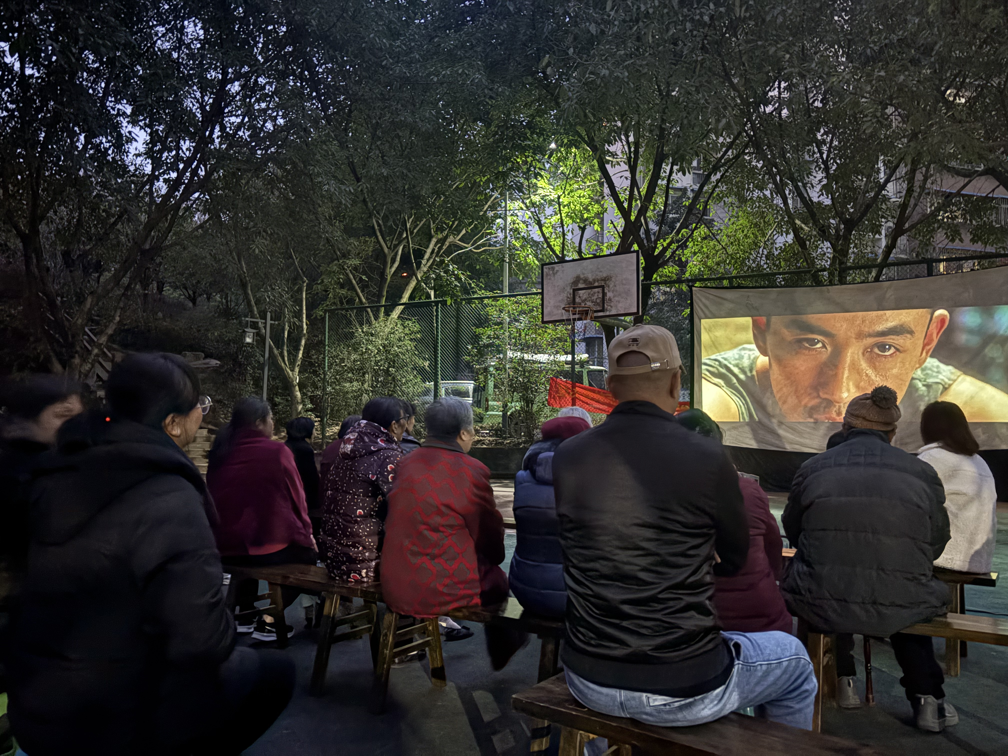 傍晚时分,工作人员早早架起幕布、调试设备。夜幕降临,居民们携家人、带小凳陆续到场。一块银幕、一台放映机,为邻里带来一场经典的电影视听体验。尽管冬夜寒冷,但大家聚在一起,边观影边轻声交流,现场气氛温馨融洽。影片中的情节也引发不少共鸣与讨论,拉近了彼此距离。