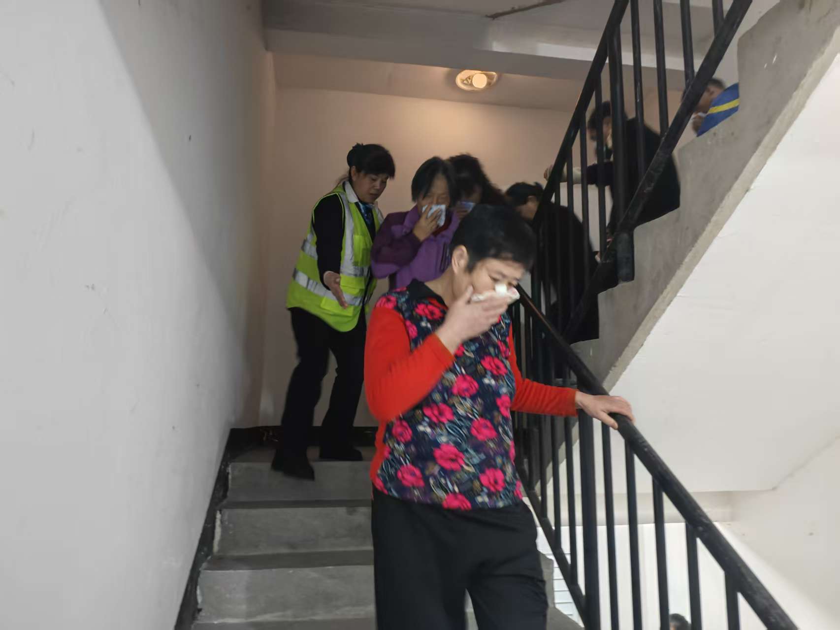 随着急促的警报声响起,演练正式启动。模拟火情发生后,灭火小组着消防服破门进行扑火,疏散小组迅速疏散引导居民用湿毛巾捂住口鼻、弯腰低姿,沿预路线快速有序撤离到安全区域,防护救助组对模拟受伤居民进行伤口消毒包扎,全程衔接紧密、有条不紊。