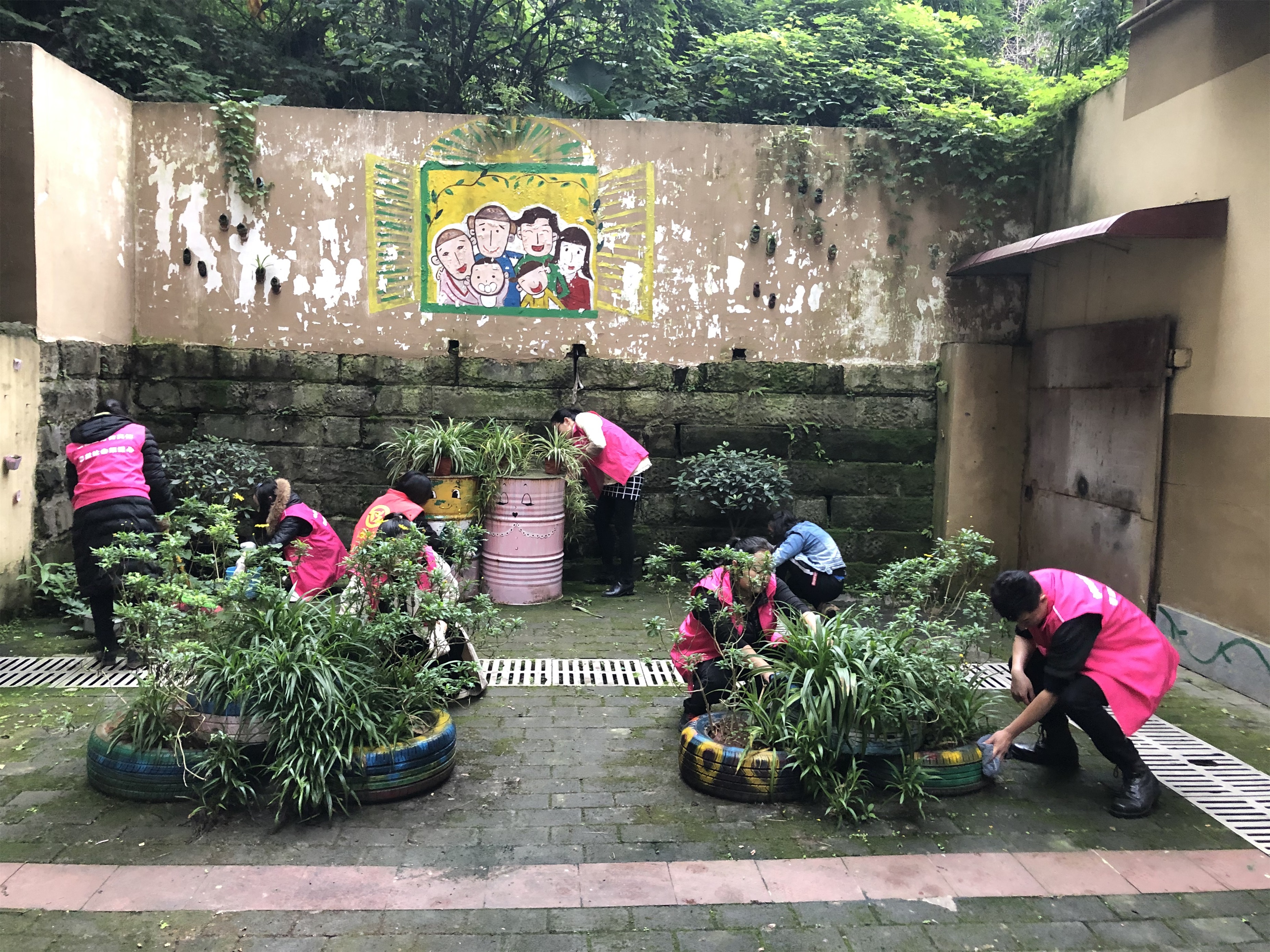 活动现场气氛热烈,大家分工协作,干劲十足。志愿者们有条不紊地进行翻土、挖坑、栽种、培土、浇水,精心种下一株株绿植和花卉。此次种植活动结合院坝空间特点,合理布局,既考虑了绿化的美观性,也注重了植物的适应性和后期管护的便利性。