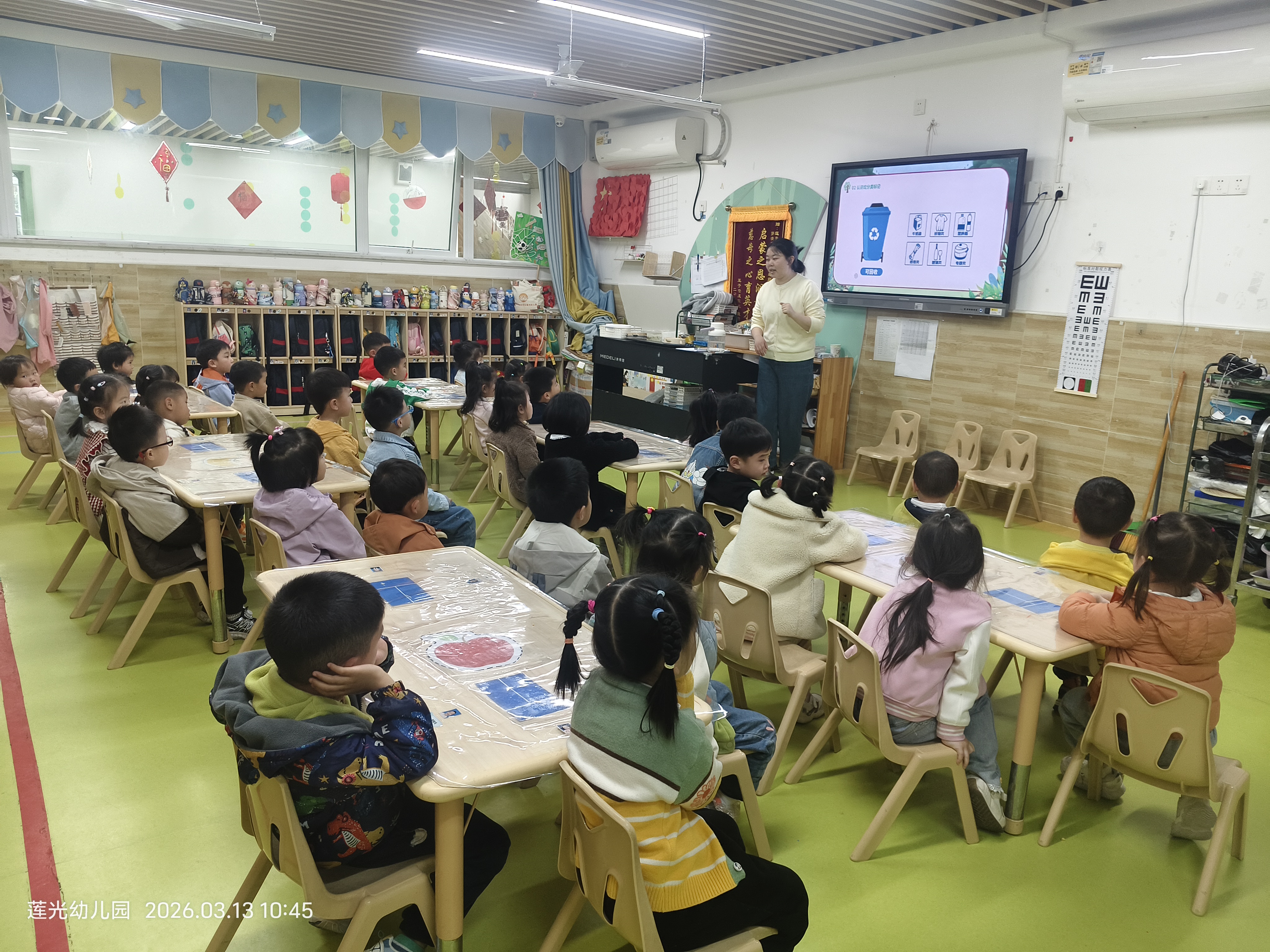活动中,宣讲人员结合幼儿年龄特点,以寓教于乐的形式开展教学。组织孩子们观看垃圾分类科普动画视频,通过色彩鲜艳、形象可爱的卡通内容,直观讲解可回收物、有害垃圾、厨余垃圾和其他垃圾的分类知识,帮助孩子们初步掌握垃圾分类方法。