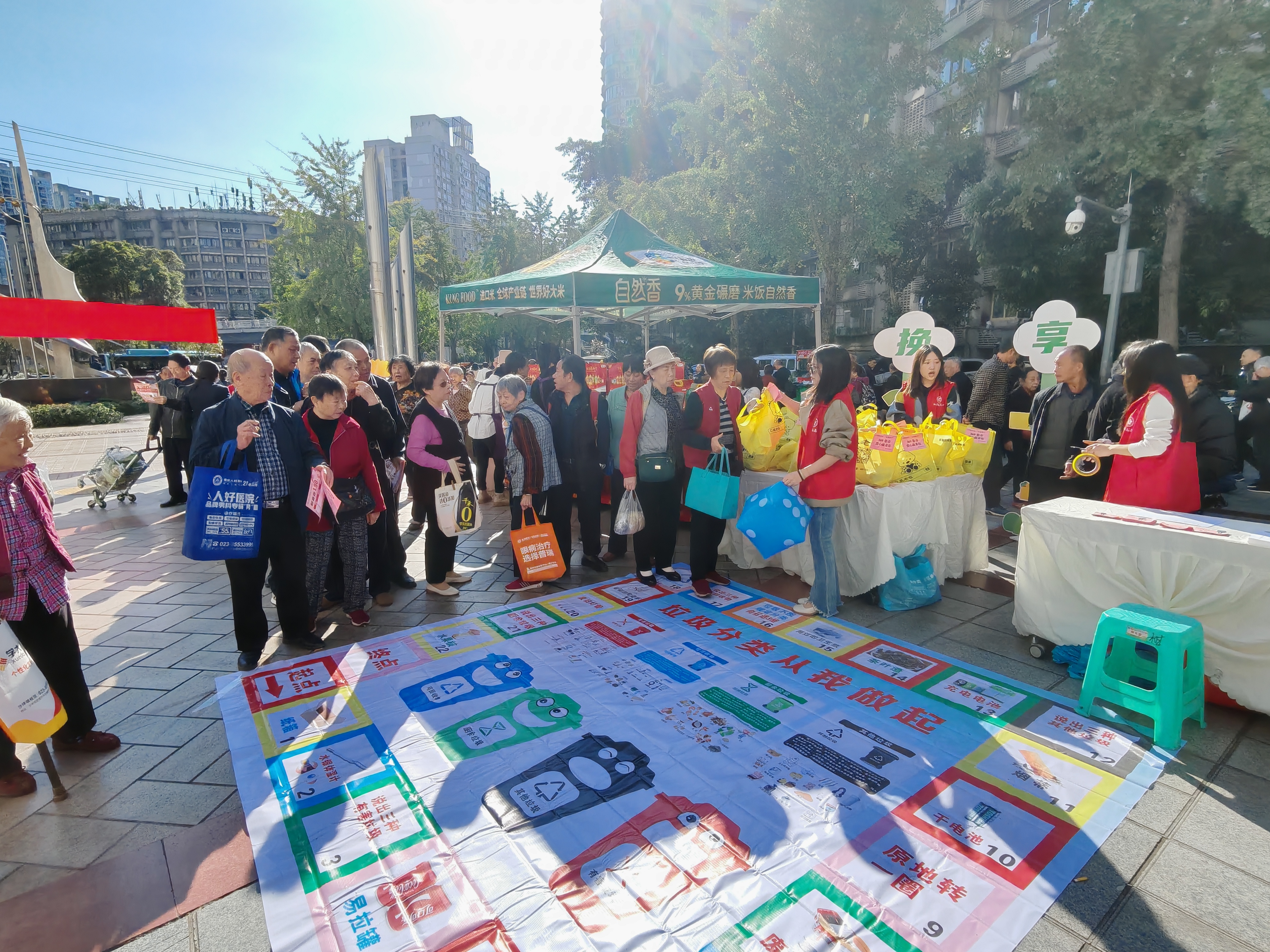 活动中,志愿者向居民科普垃圾分类的重要意义、常见垃圾如何分类、垃圾分类的标准和具体操作步骤等知识,同时配合垃圾分类飞行棋的活动,进行有奖问答,居民通过扔骰子移动步数,回答垃圾分类问题。通过游戏的方式,加强了居民垃圾分类意识。