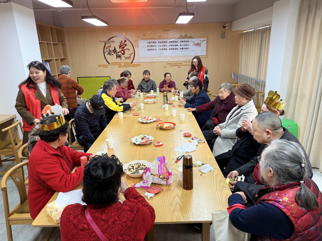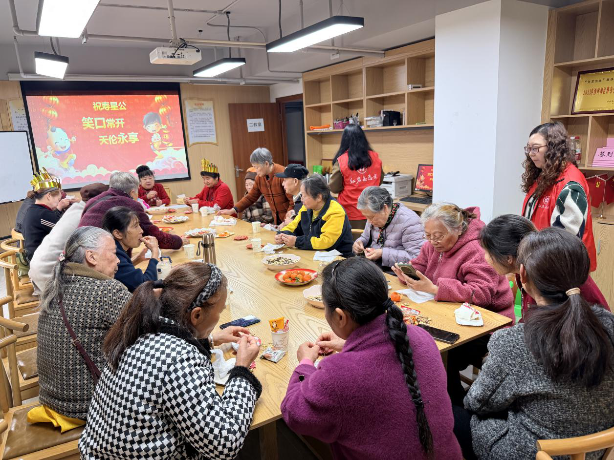 手工完成后,集体生日会温情启幕。志愿者为5位寿星戴上生日“王冠”,点燃生日蜡烛,欢快的生日歌响起,全体人员共同唱响祝福,寿星们双手合十,默默许下美好心愿。随后,大家围坐在一起,分享香甜的生日蛋糕,嗑着瓜子、剥着花生、品着茶点,拉家常、话冷暖,畅谈生活趣事、诉说美好期许,温情在欢声笑语中悄然传递,现场氛围格外温馨和睦。