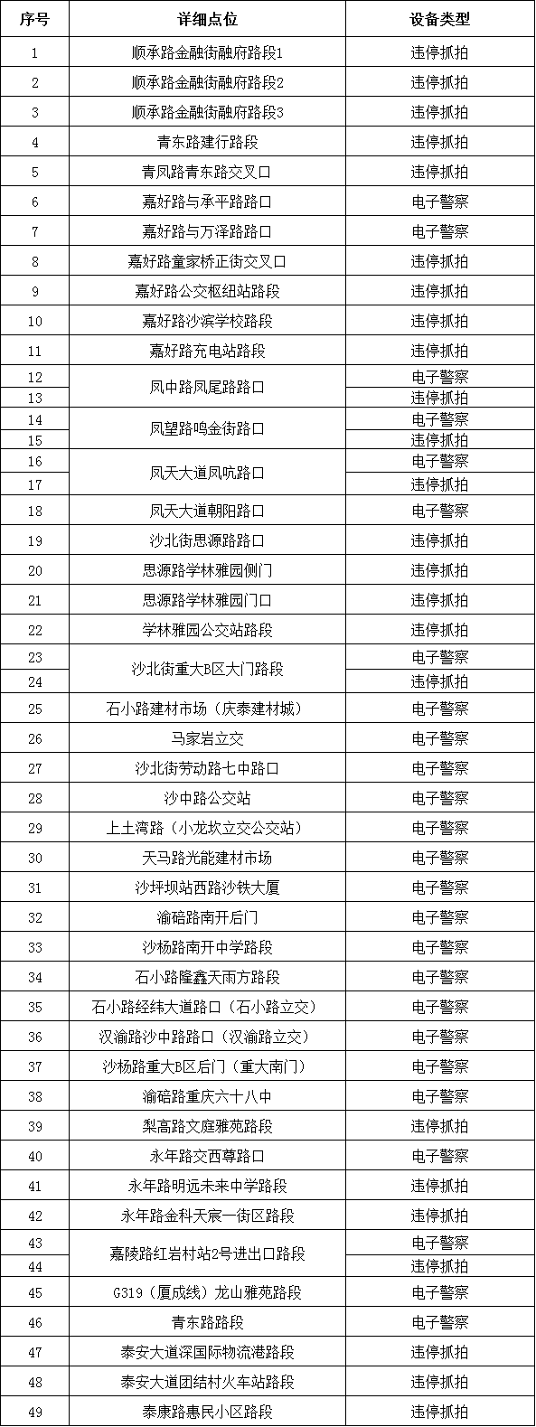 为进一步加强道路交通安全管理,规范道路通行和停车秩序,有效预防和减少道路交通事故,保障辖区群众出行安全,根据公安部《道路交通安全违法行为处理程序规定》(第157号令)第十六条规定,即日起,沙坪坝区公安分局交巡警支队在辖区内新增24套违停抓拍和25套电子警察设备,共计49套交通技术监控设备,对机动车违反交通信号指示通行和违法停车等交通违法行为进行实时抓拍。