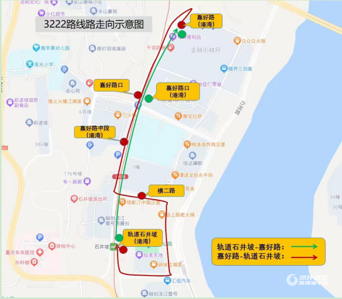 逆向:轨道石井坡、嘉好路口、嘉好路,全程运行约5分钟。