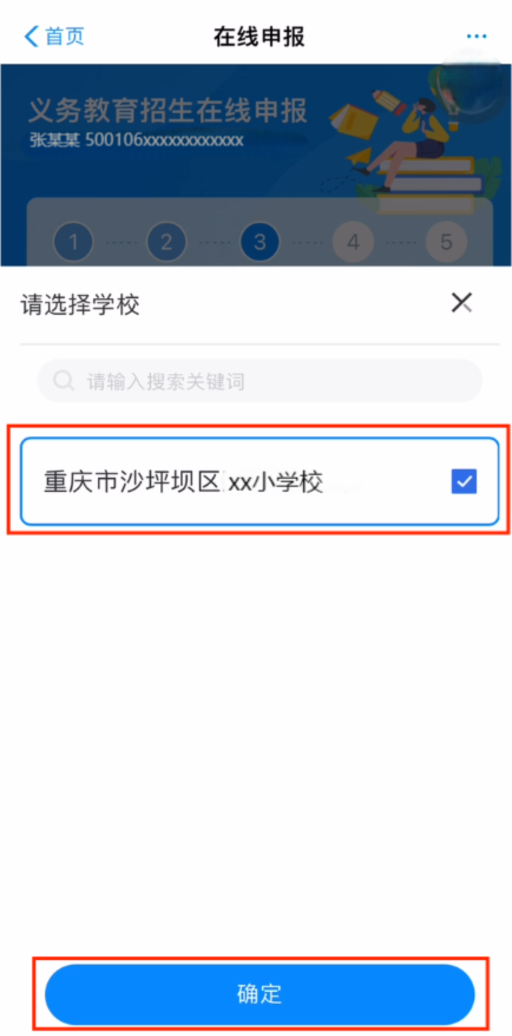 系统自动根据信息匹配可报名小学。点击“请选择”区域,选择学校后,点击“确定”。