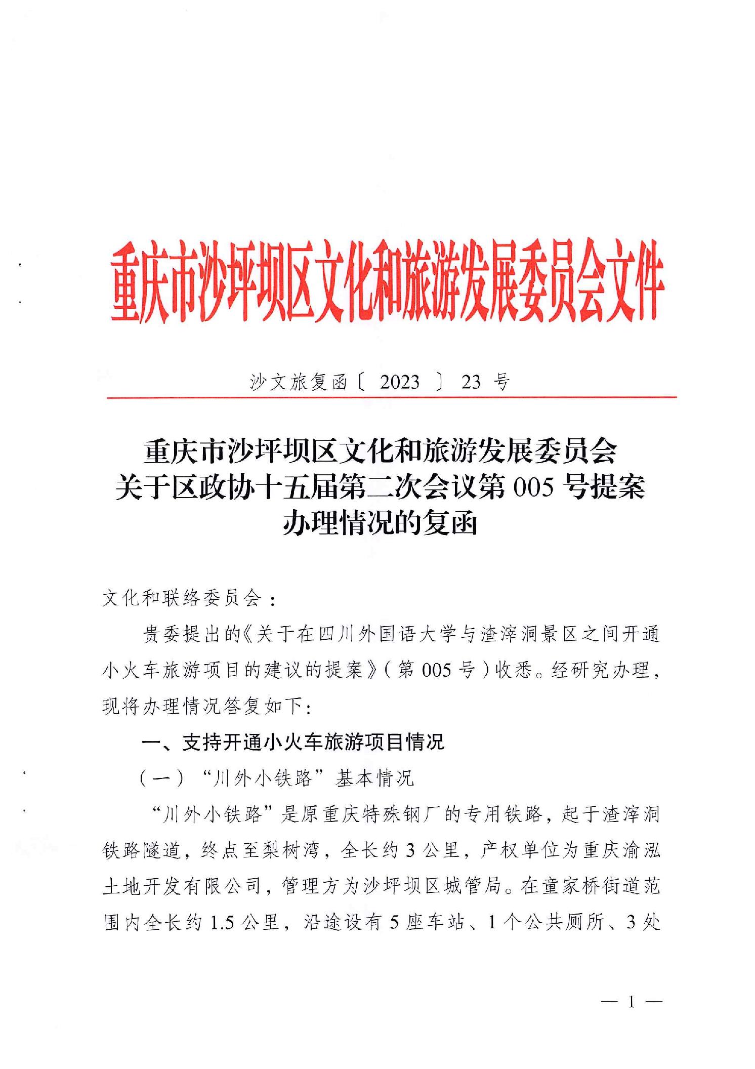 重庆市沙坪坝区文化和旅游发展委员会关于区政协十五届第二次会议第005号提案办理情况的复函