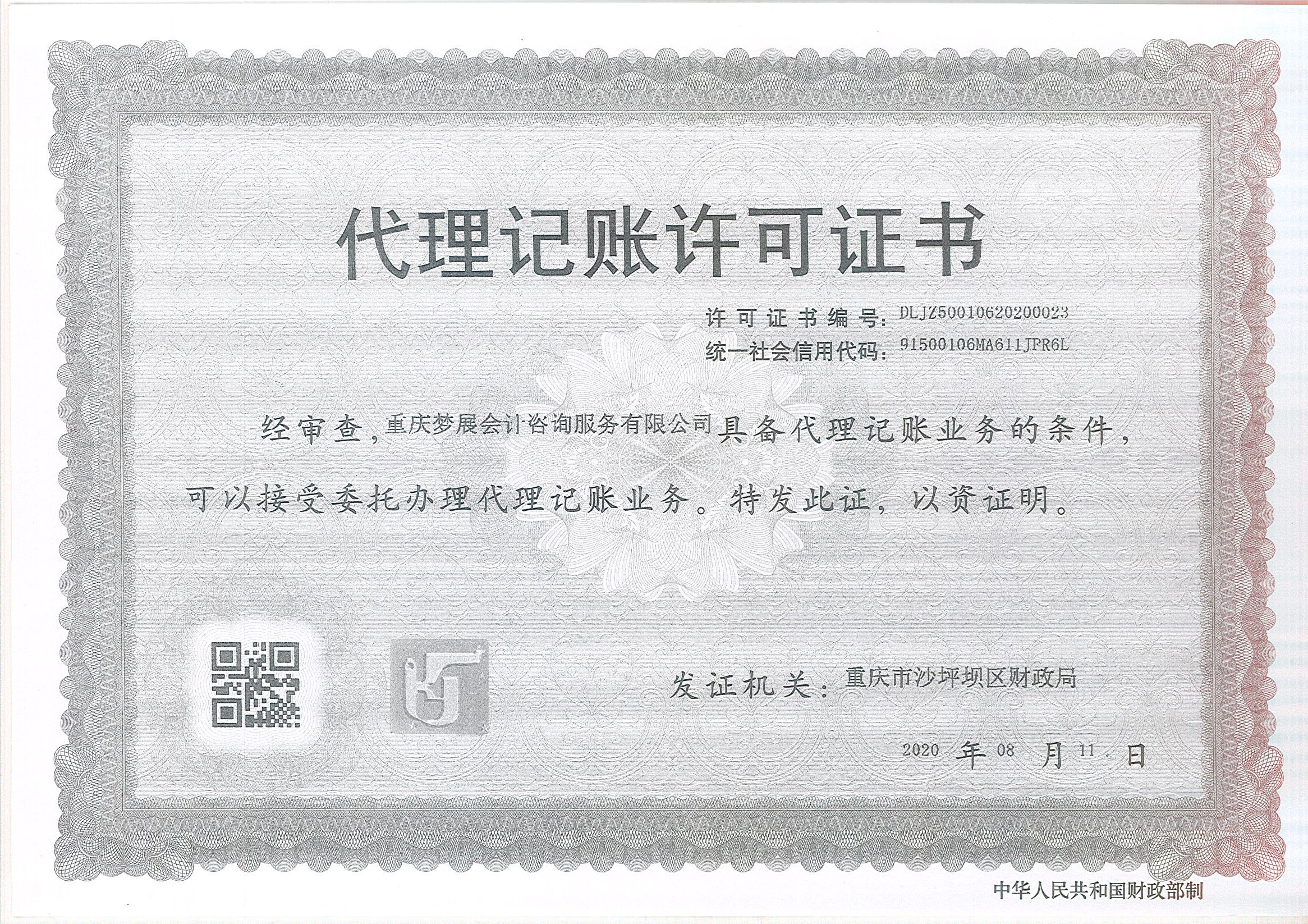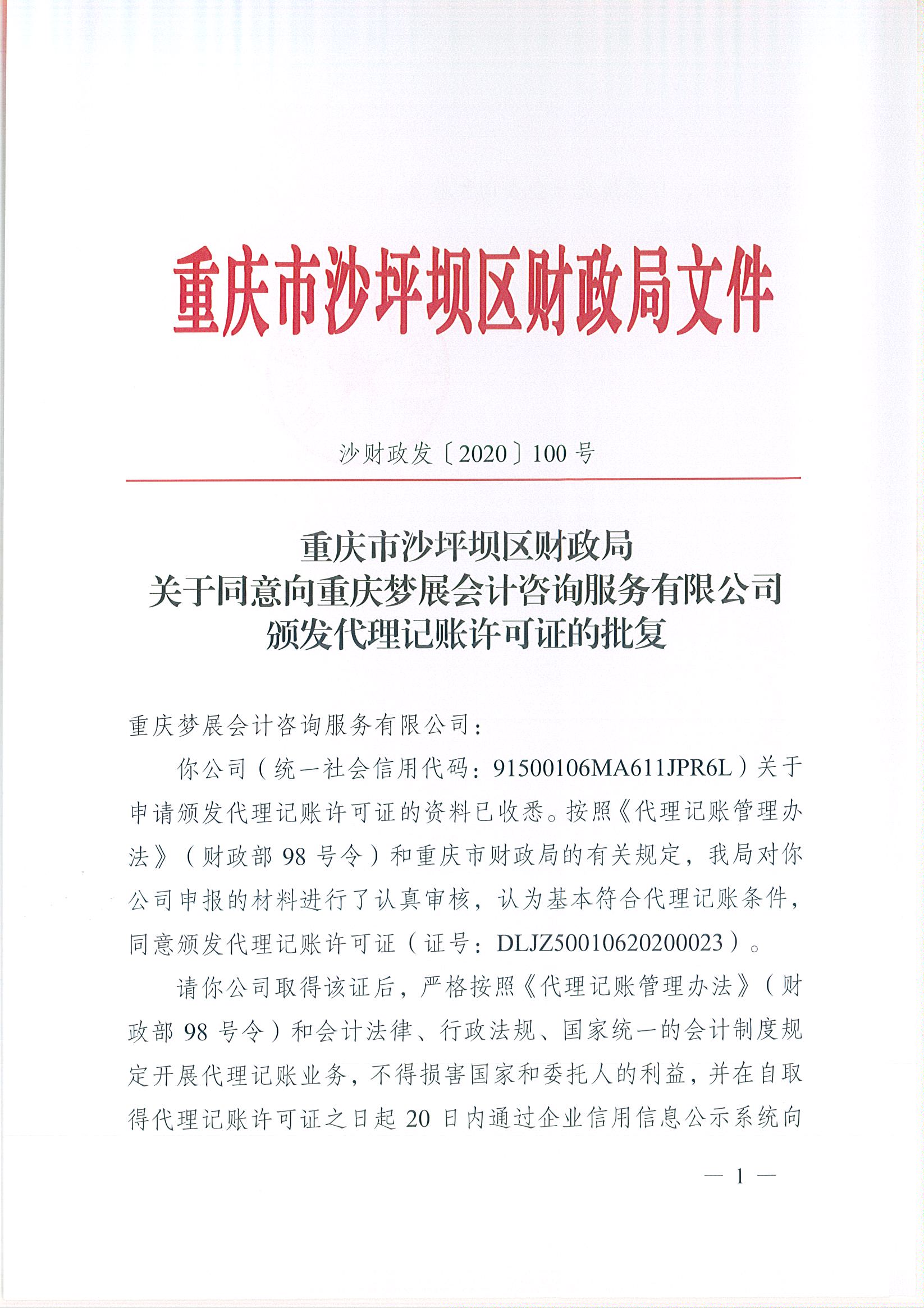 | 名称: | 重庆市沙坪坝区财政局关于同意向重庆凯贤企业管理咨询有限公司颁发代理记账许可证的批复 | ||||