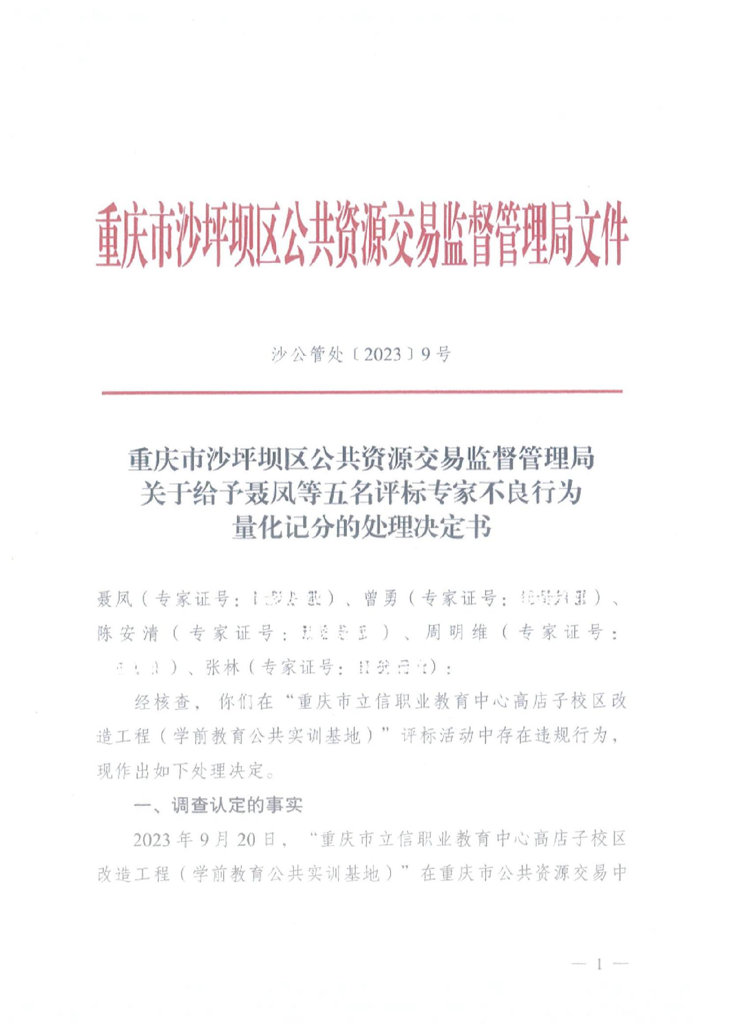 重庆市沙坪坝区公共资源交易监督管理局关于给予聂风等五名评标专家不良行为量化记分的处理决定书