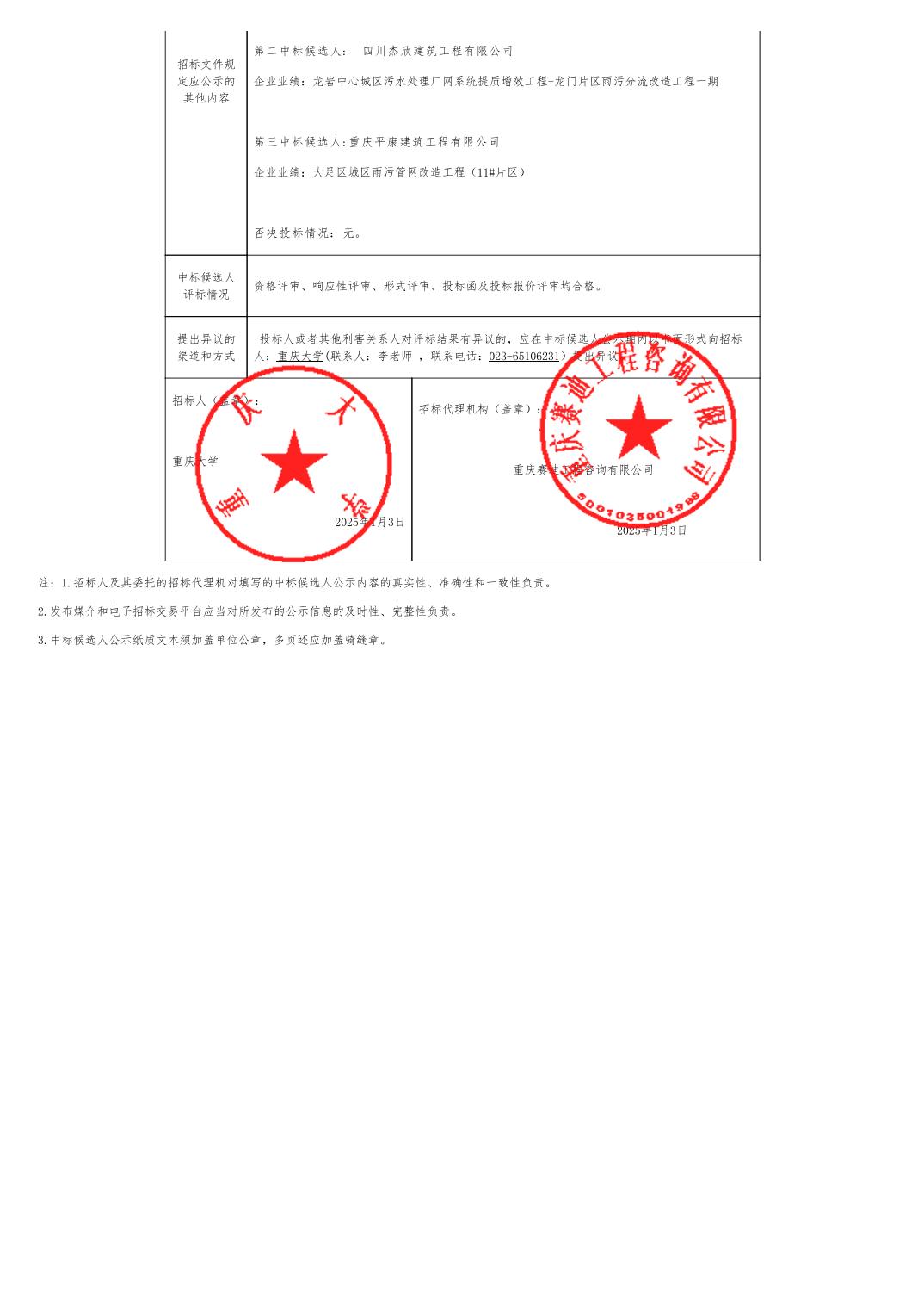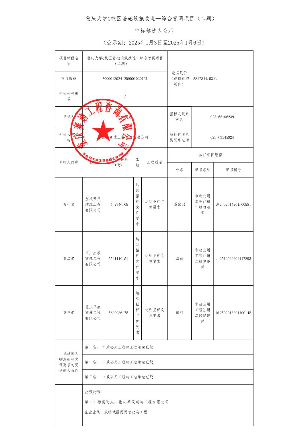 重庆大学C校区基础设施改造--综合管网项目(二期)中标候选人公示