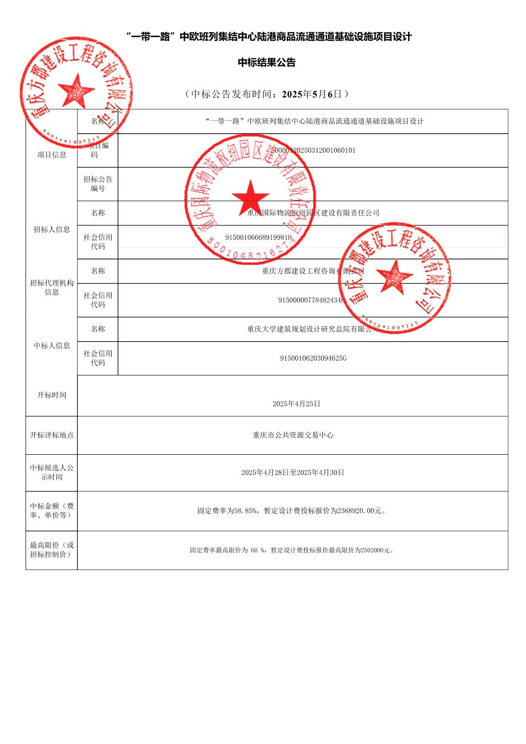 “一带一路”中欧班列集结中心陆港商品流通通道基础设施项目设计中标结果公告