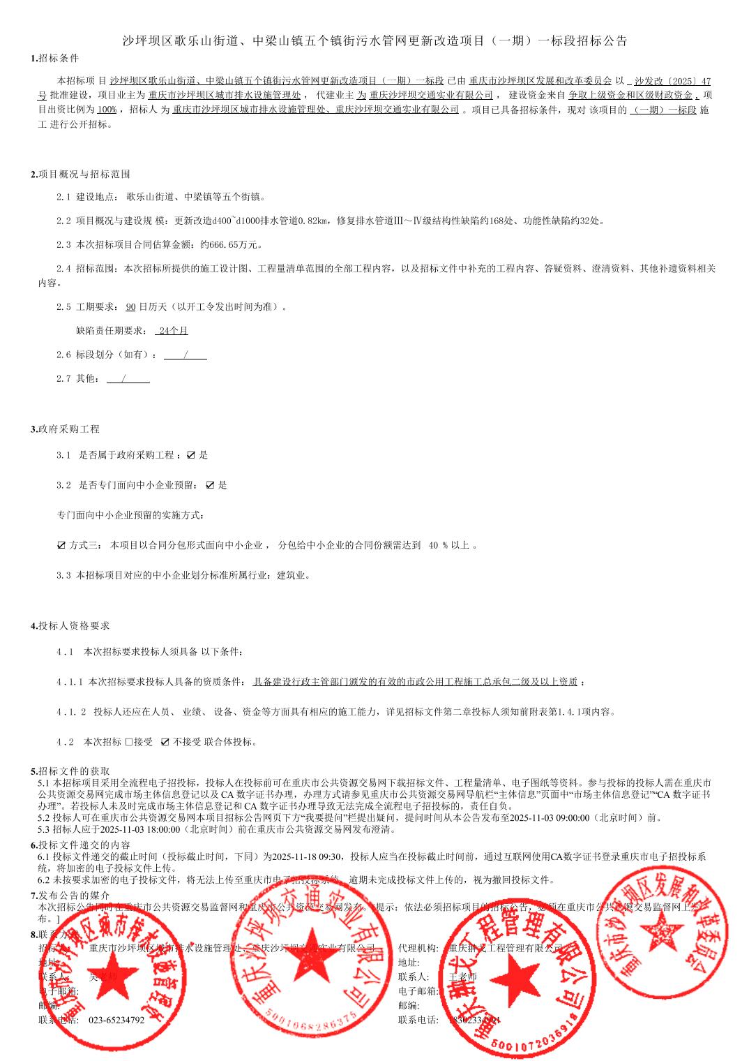 沙坪坝区歌乐山街道、中梁山镇五个镇街污水管网更新改造项目(一期)一标段招标公告
