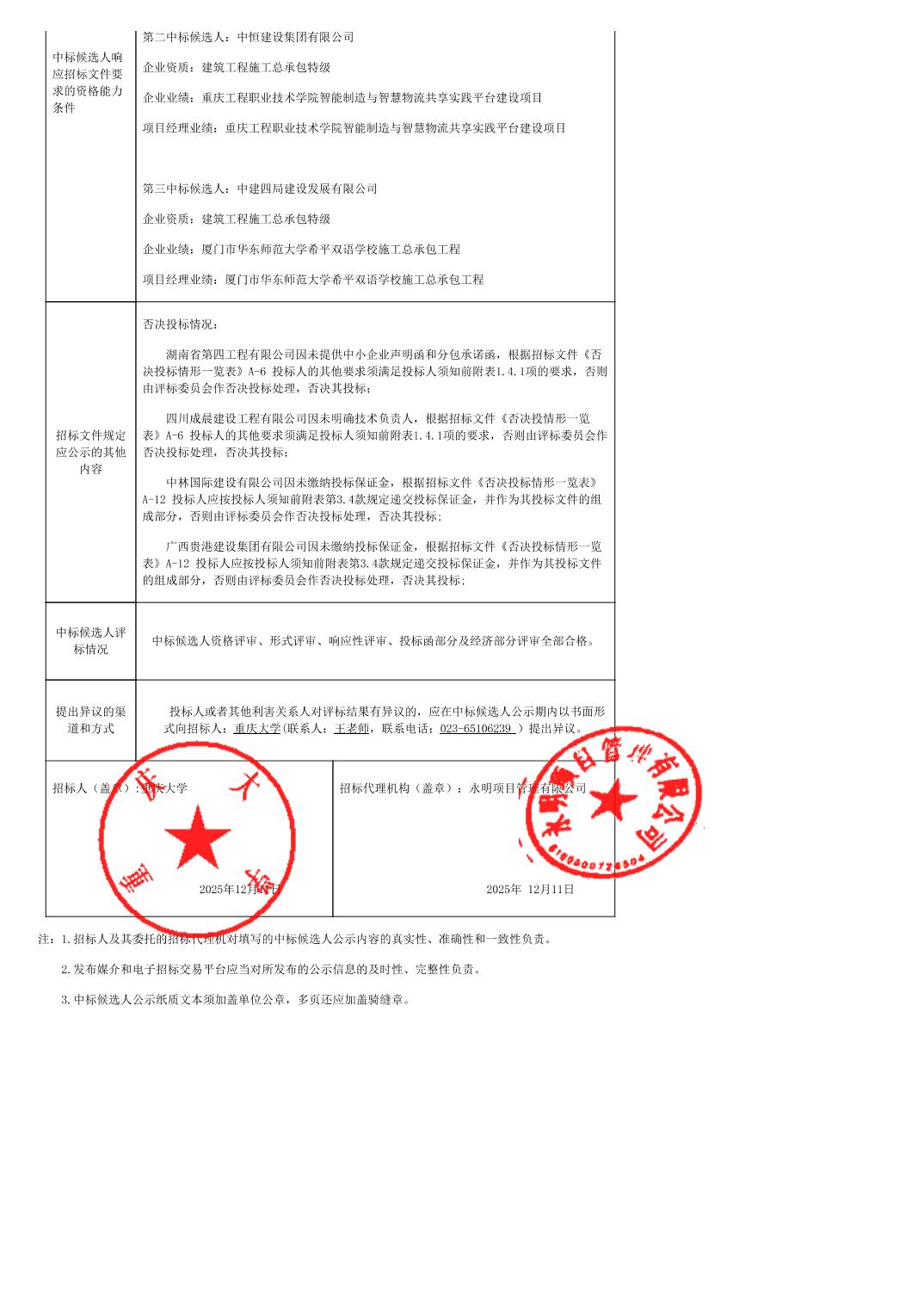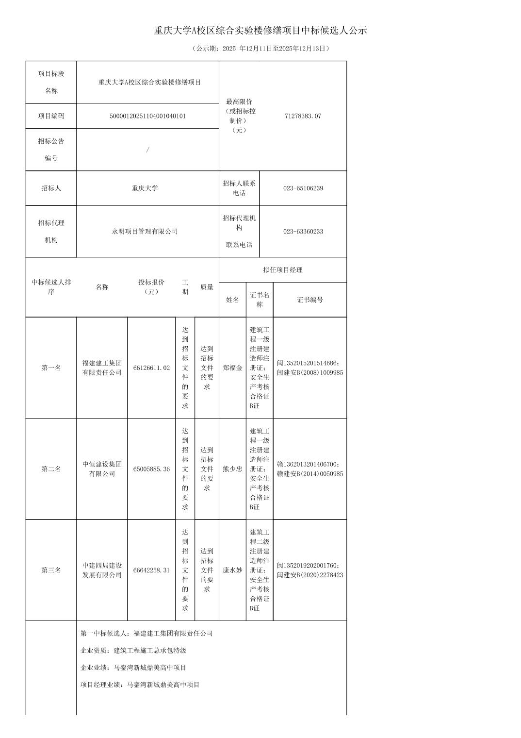 重庆大学A校区综合实验楼修缮项目中标候选人公示
