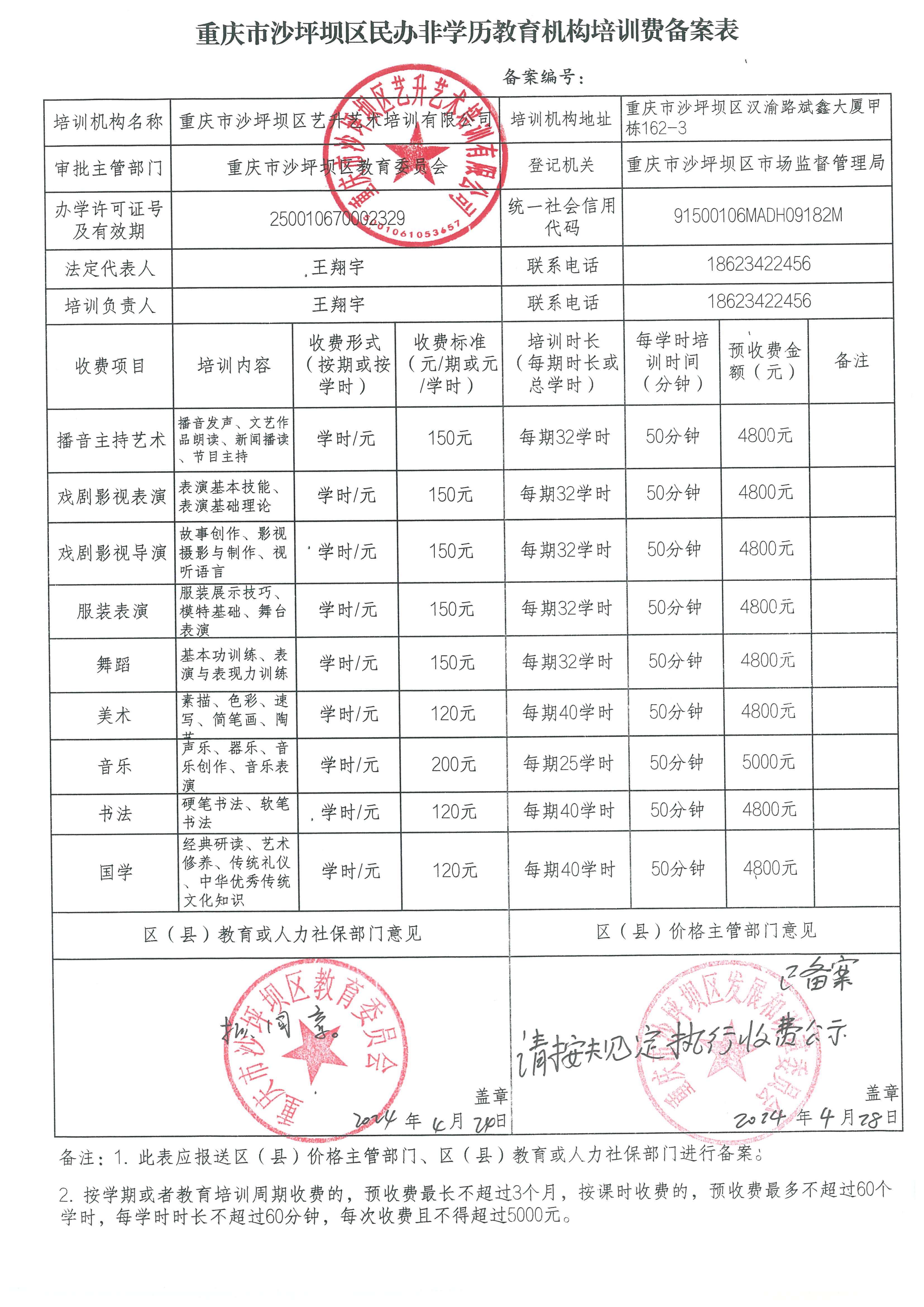 沙坪坝区艺升艺术民办非学历教育机构培训收费备案情况