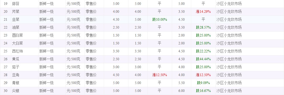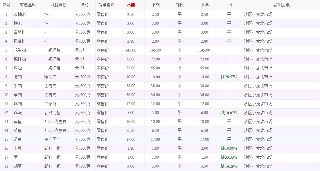 | 名称: | 粮油内禽蛋菜水产品等价格应急监测信息(沙区小龙坎农贸市场)采价日期(2025年9月22日) | ||||