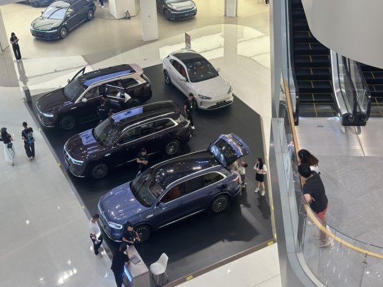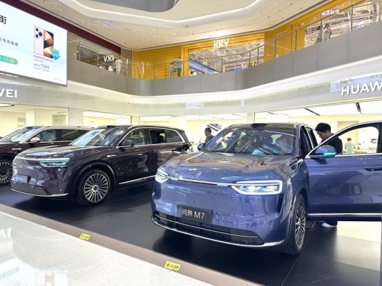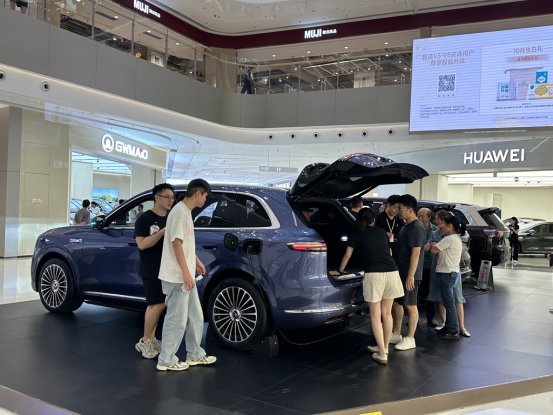 10月1日,在位于沙坪坝区的一新能源汽车门店,市民选购问界M7等车型,前来看车的市民络绎不绝。