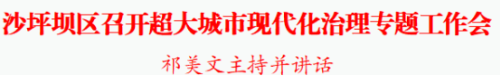 10月20日下午,沙坪坝区召开超大城市现代化治理专题工作会。区委书记祁美文出席并讲话。他强调,要深入贯彻习近平总书记关于城市工作的重要论述和视察重庆重要讲话重要指示精神,全面贯彻中央城市工作会议决策部署,深入践行人民城市理念,认真落实市委六届七次全会精神,坚持问题导向,深化改革创新,不断提升超大城市发展、服务、治理能力。