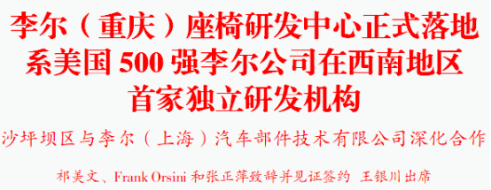 李尔公司是美国最大的汽车零部件供应商之一。作为全球汽车座椅和电子电气技术引领者、美国《财富》500 强企业,李尔公司专注于为全球主要汽车制造商设计、制造并交付先进的产品和技术。凭借超过100年的传承发展,目前,李尔的产品覆盖全球480多个汽车品牌,为全球消费者提供卓越的车载体验。今年1月,李尔智能座椅生产基地正式落地沙坪坝区,仅用半年时间就实现投产。此次落户沙坪坝区的李尔(重庆)座椅研发中心,是李尔公司在我国西南地区建立的首家独立研发机构,将作为亚太区技术研发枢纽,入驻400余名科研人才,聚焦智能座舱、新能源汽车电子系统、轻量化材料等核心领域,承担亚太地区核心技术研发任务,打造“全球技术+本土适配”的研发高地。研发中心建成后,将优先与中国长安、赛力斯集团等本地车企开展联合研发,与重庆大学等高校深化产学研合作,助力区域汽车产业向智能化、新能源化升级,为沙坪坝建设现代化产业体系、助推重庆汽车产业高质量发展注入强劲动力。
