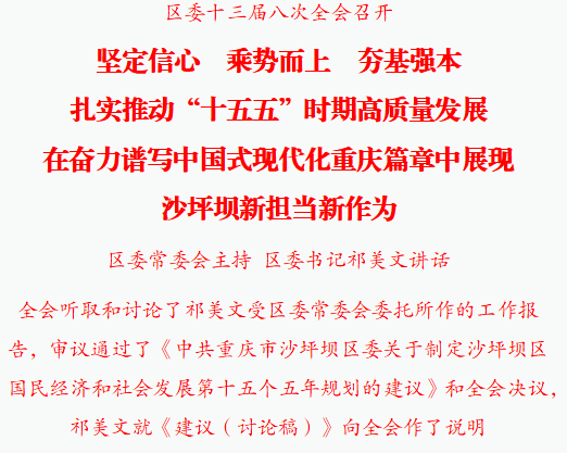 全会号召,谋划好、推进好“十五五”时期的沙坪坝发展,使命光荣、责任重大。全区广大干部群众要更加紧密地团结在以习近平同志为核心的党中央周围,深入贯彻党的二十届四中全会精神、中央经济工作会议精神,在市委的坚强领导下,牢记嘱托、感恩奋进,干字当头、唯实争先,加快推进沙坪坝现代化建设,为奋力谱写中国式现代化重庆篇章贡献更大力量。