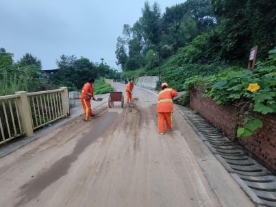 区公路养护中心保洁人员在清理路面泥土