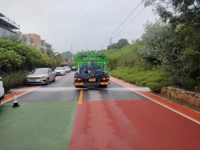 区公路养护中心出动车辆清洗路面