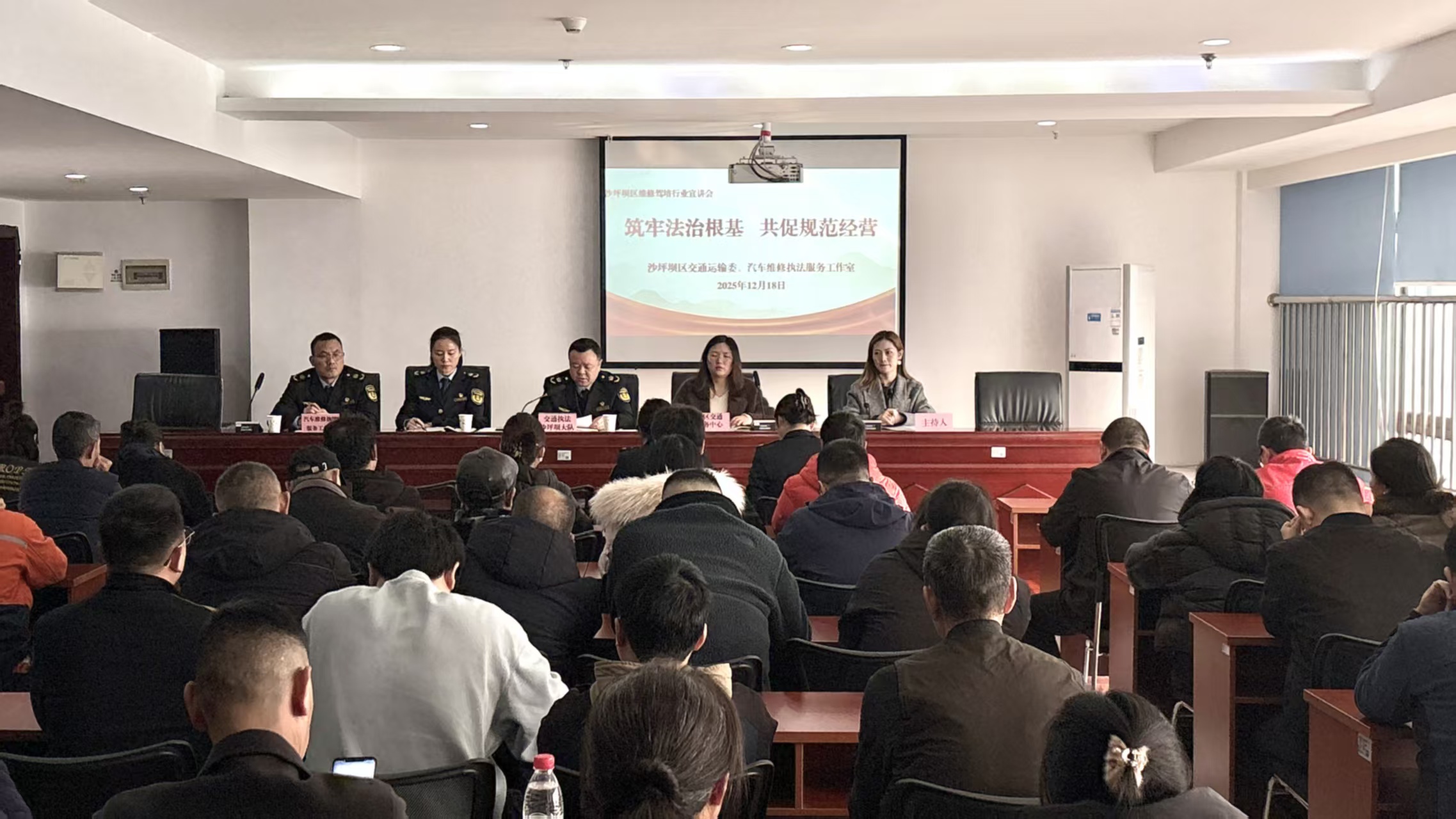 12月18日,沙坪坝区交通运输委邀请交通行政执法沙坪坝大队“行安我护·安心修车”汽车维修执法服务工作室开展了一场“筑牢法治根基、共促规范经营”的法治宣讲,辖区汽车维修一二类企业、部分三类维修企业、正在申请备案的维修企业等约70家企业负责人参加。