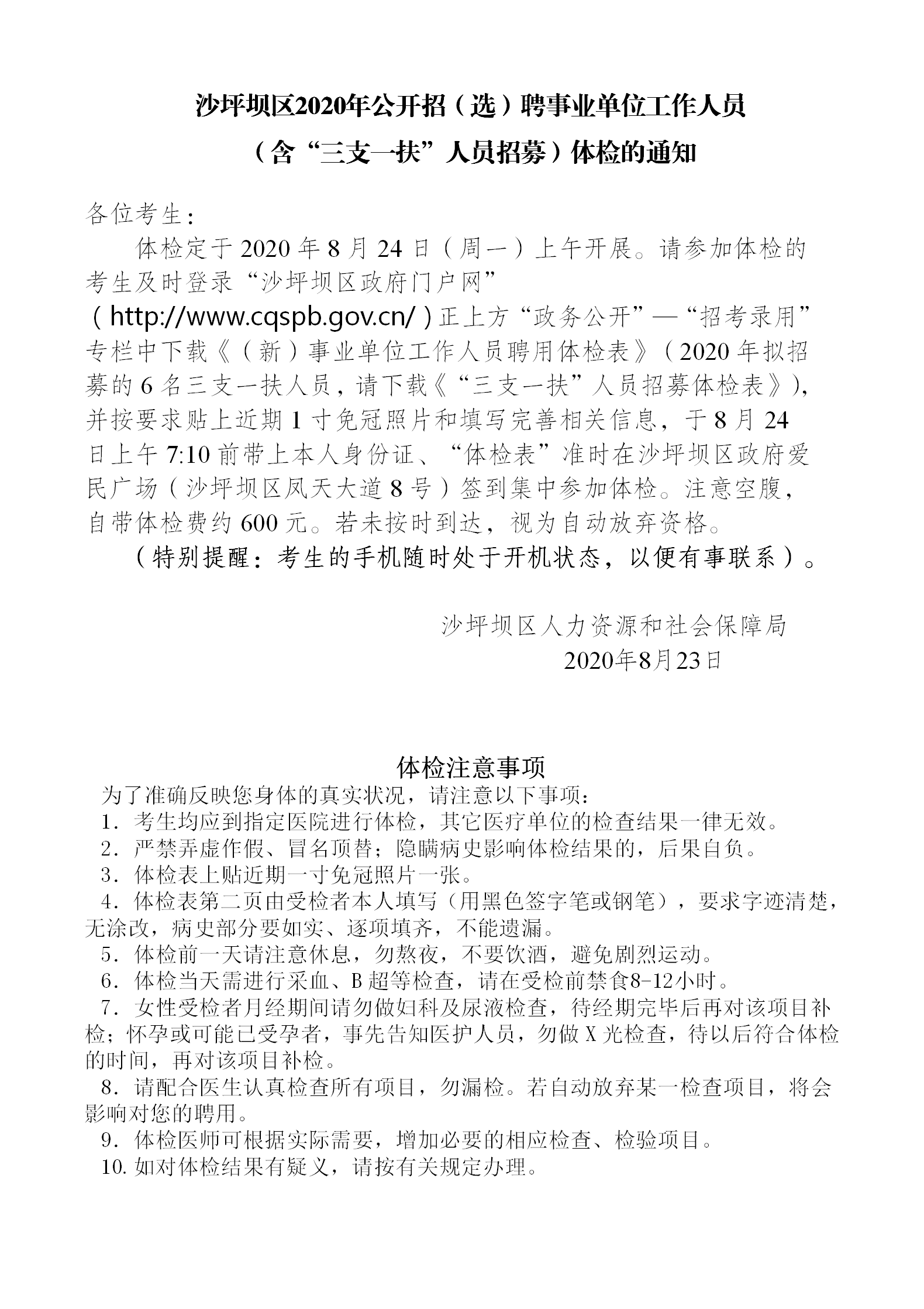 | 名称: | 沙坪坝区2020年公开招(选)聘事业单位工作人员(含“三支一扶”人员招募)体检的通知 | ||||
