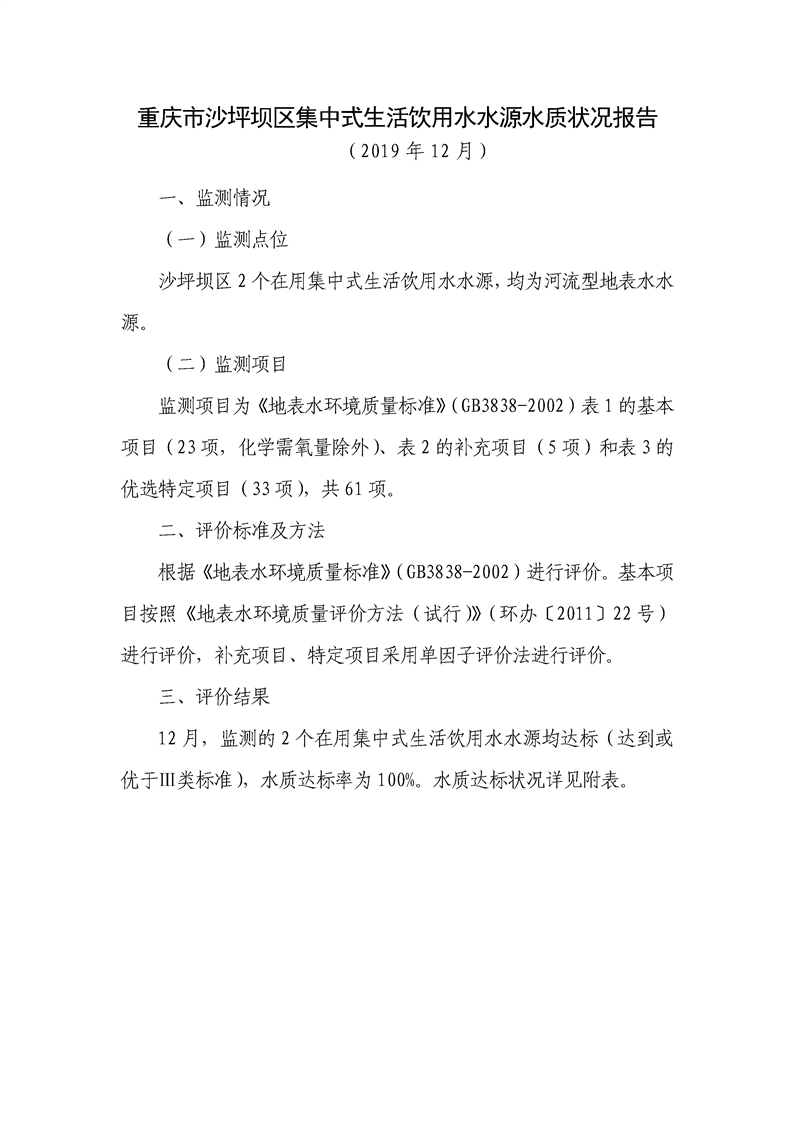重庆市沙坪坝区集中式生活饮用水水源水质状况报告2019年12月