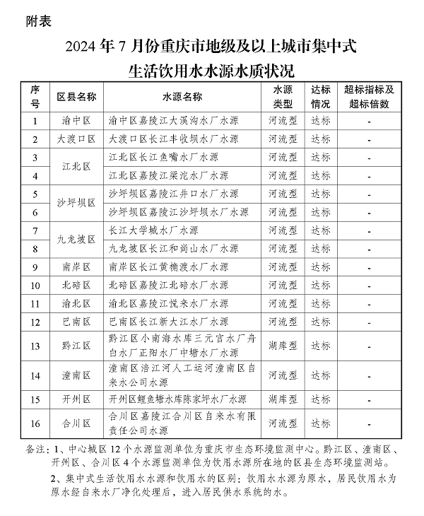 2024年7月份重庆市地级及以上城市集中式生活饮用水水源水质状况