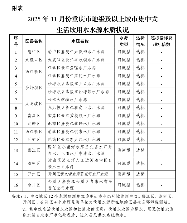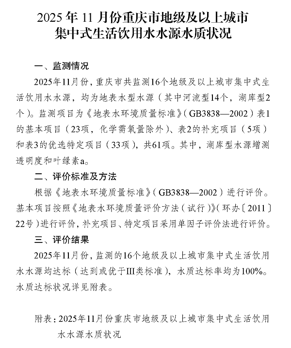 2025年11月份重庆市地级及以上城市集中式生活饮用水水源水质状况