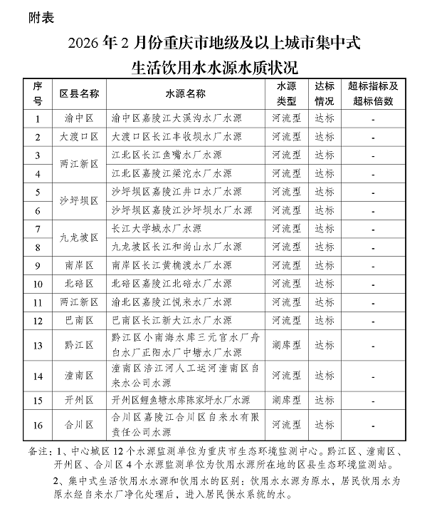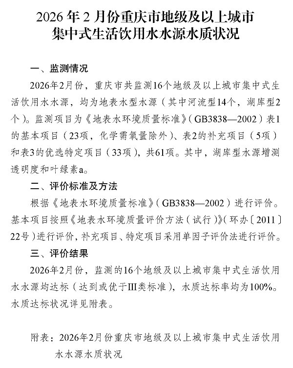 2026年2月份重庆市地级及以上城市集中式生活饮用水水源水质状况