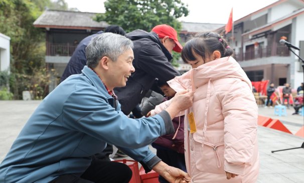“冬日暖阳”慰问环节,“红岩军休”沙坪坝志愿服务团代表为社区少年儿童送上精心准备的新年礼物,鼓励他们勤奋学习、健康成长。孩子们接过满载关怀的礼物,穿上崭新的羽绒服,脸上绽放出幸福的笑容。