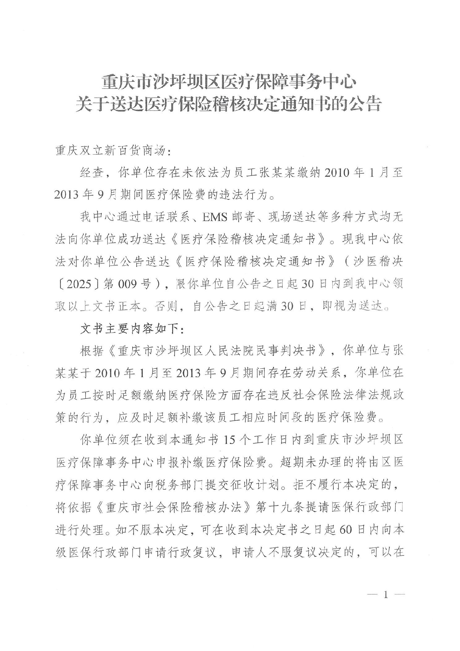 重庆市沙坪坝区医疗保障事务中心关于送达医疗保险稽核决定通知书的公告