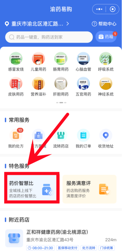 第二步:在“就医购药”栏目选择“渝药易购”服务。